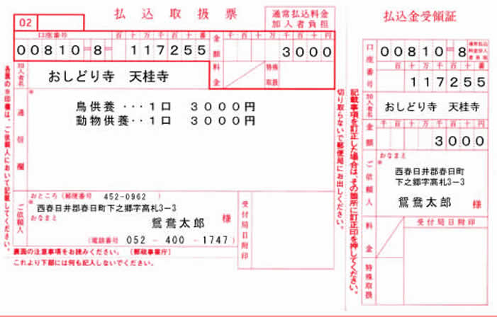 直接ご来寺して頂く他、郵便局の払込取扱票でも、受付を取り扱います。 払込振込票に必要事項を御記入の上、払込み下さい。→払込取扱票見本 確認でき次第、御供養の上、お札を発送させて頂きます。